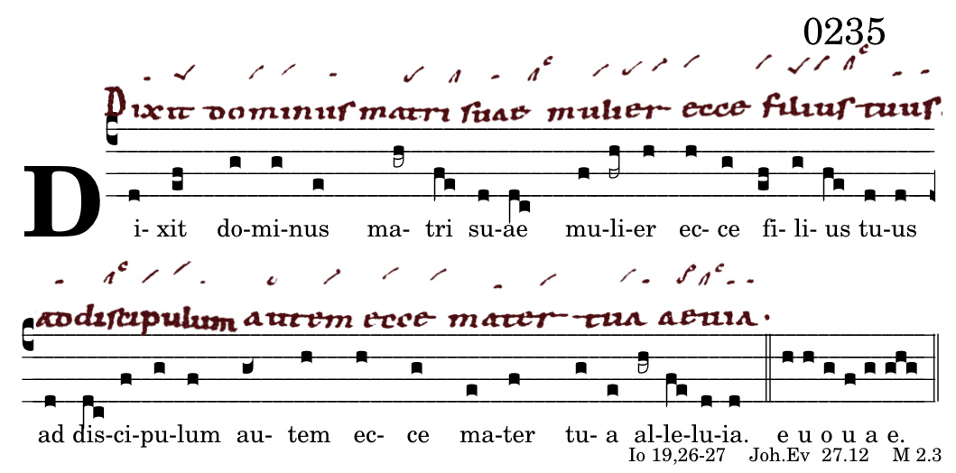 | Ad Magnificat, ant. Dixit Dóminus matri suæ: Múlier, ecce fílius tuus. Ad discípulum autem: Ecce mater tua. | A Magnificat : Le Seigneur dit à sa mère : ‘Femme, voici ton fils’. Puis, au disciple : ‘Voici ta mère’. |