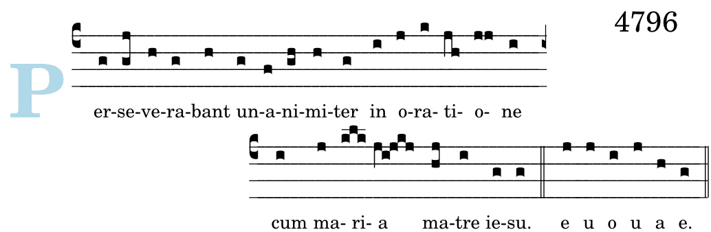 | Ant. ad introitumCf. Ac 1, 14 Erant discípuli perseverántes unanímiter in oratióne cum María, matre Iesu. | Antienne d’ouverture. cf. Ac 1, 14 D’un seul cœur, les Apôtres participaient fidèlement à la prière avec Marie, la mère de Jésus. |